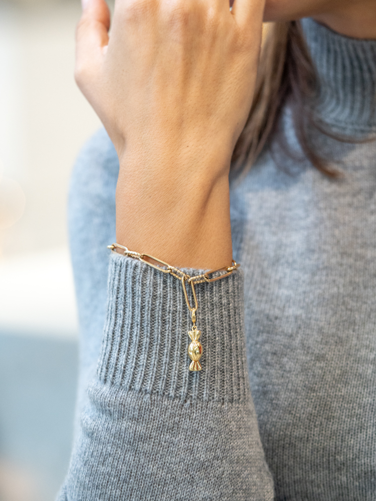 Zlatni privezak u obliku bombone iz kolekcije Aqua Charms unosi dašak slatkoće, radosti i razigrane energije u svaki dan.