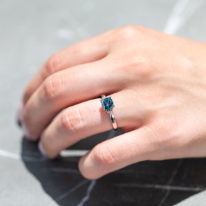 Nebesko plava boja London blue topaza je istaknuta sa po tri bela dijamanta koja stoje sa svake njegove strane. Sofisticiran izgled prstena će pristajati damama koje vole vredan nakit i retko poludrago kamenje.