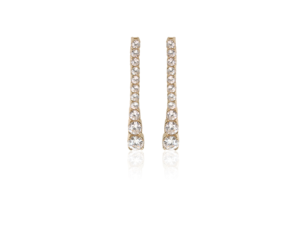 Viseće minđuše od zlata sa cirkonima različitih veličina. Dinamičan prelaz kamenčića stvara igru svetlosti i vizuelno izdužuje vrat. Sofisticiran izbor za venčanja ili svečanosti u kojima želite posebno da zasijate. Možete ih kompletirati sa ogrlicom i narukvicom istog dizajna i tako napraviti set koji ćete, zbog njegovog vanvremenskog dizajna, voleti i nositi celog života.